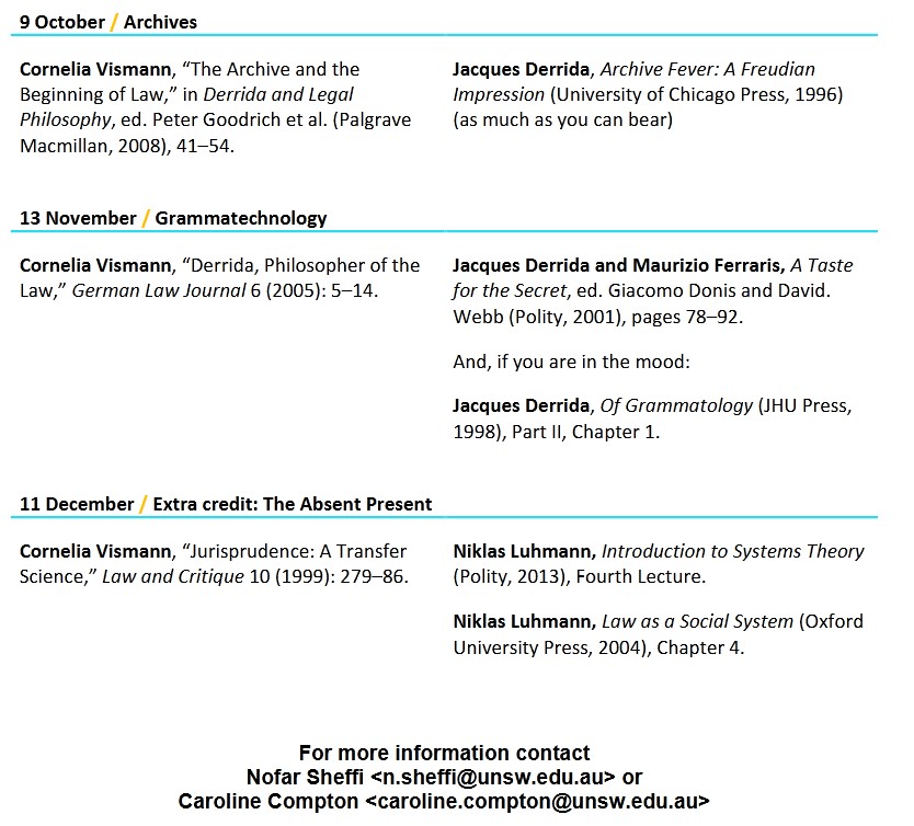 Die für mich entscheidenden Passagen aus dem Vorwort von Das Recht und seine Mittel (2012) von Cornelia Vismann sind nicht die anfänglichen Hinweise auf das Schattendasein, das eine bestimmte Wissenschaft geführt haben soll. Der Hinweis auf das Schattendasein wird dort leicht verstellt, indem dieses Schattendasein einem anderen Wissen beigestellt wird, nämlich dem einer umfassenden Erforschung. Umfassende Erforschung hier, Schattendasein da: Diese Positionierungen verschalen leicht, auch wenn es nicht falsch ist, Positionen zu unterscheiden und die Unterscheidungen, auch weil sie mit Stratifikation in Form von Gewichtungen einhergeht, durchaus ein Gegenstand dessen ist, was man unter Geschichte und Theorie der juridischen Kulturtechniken verstehen kann.