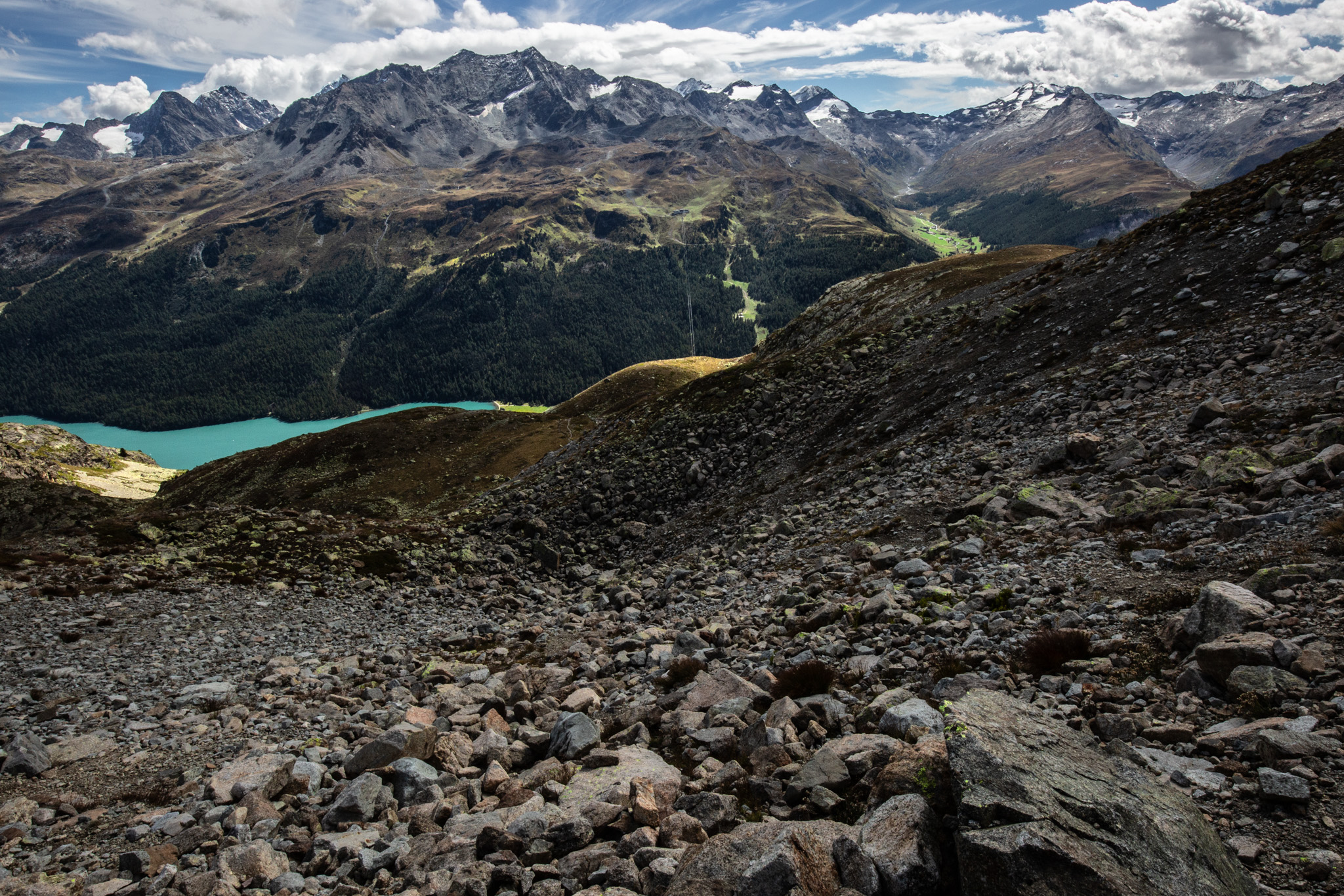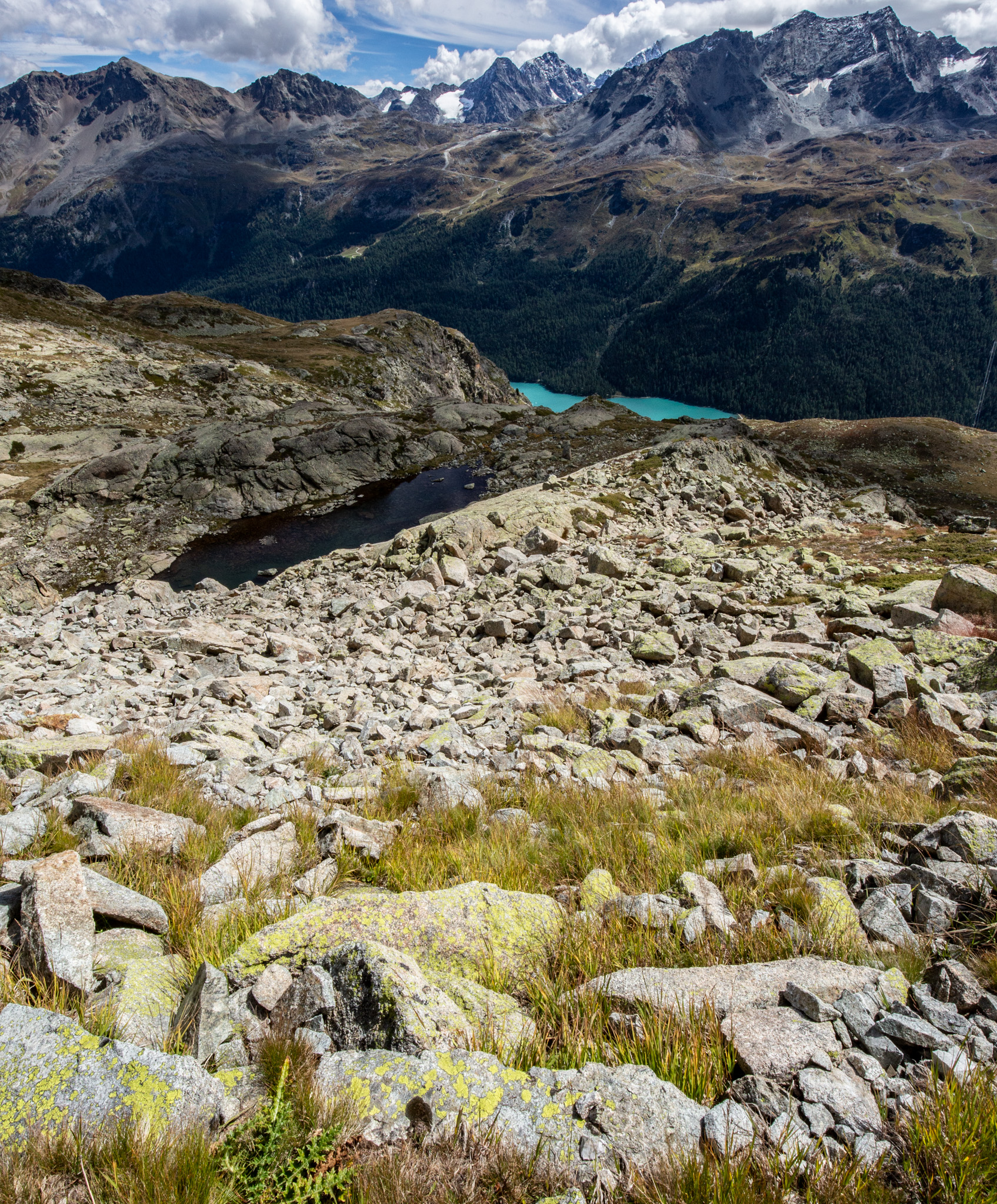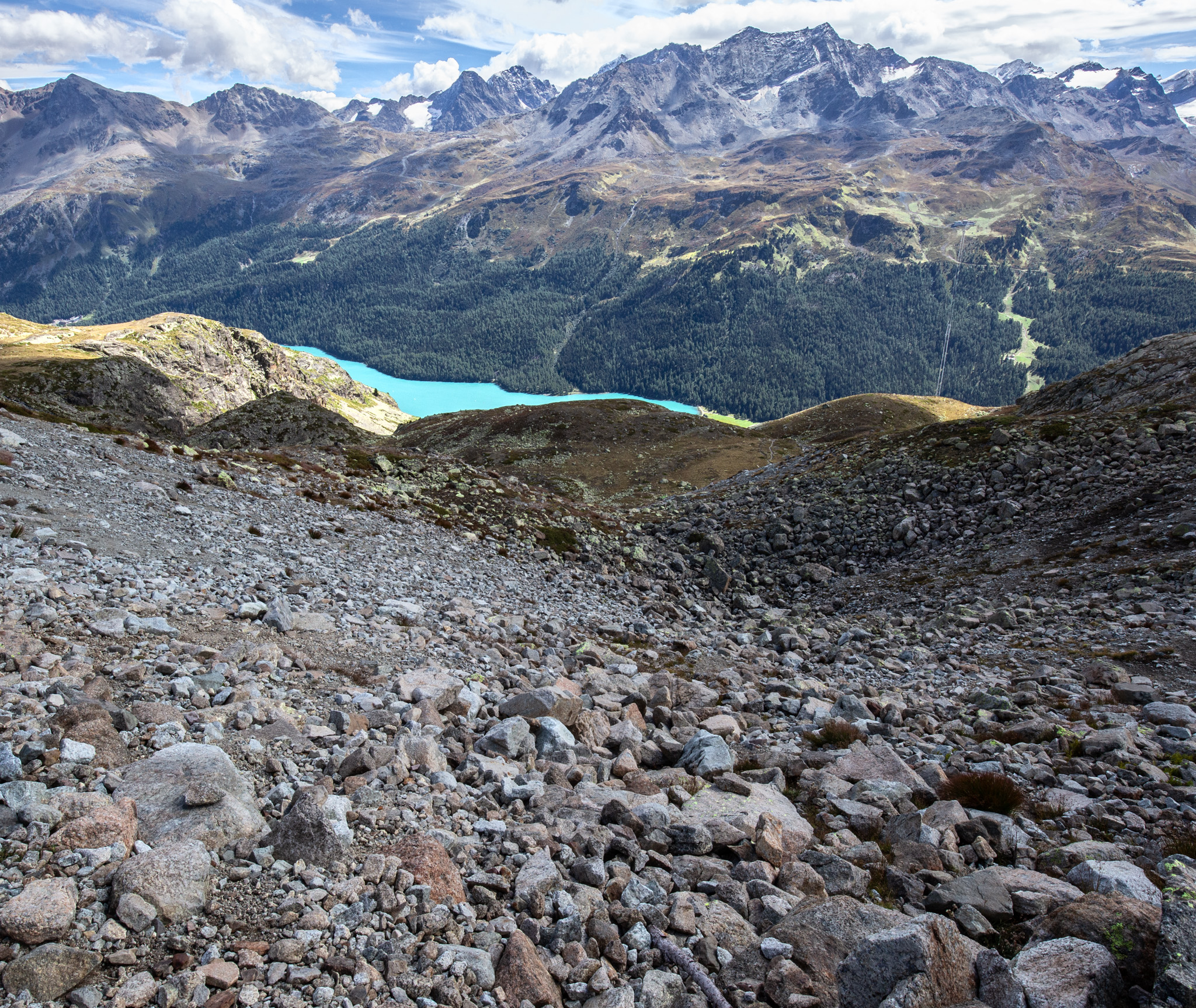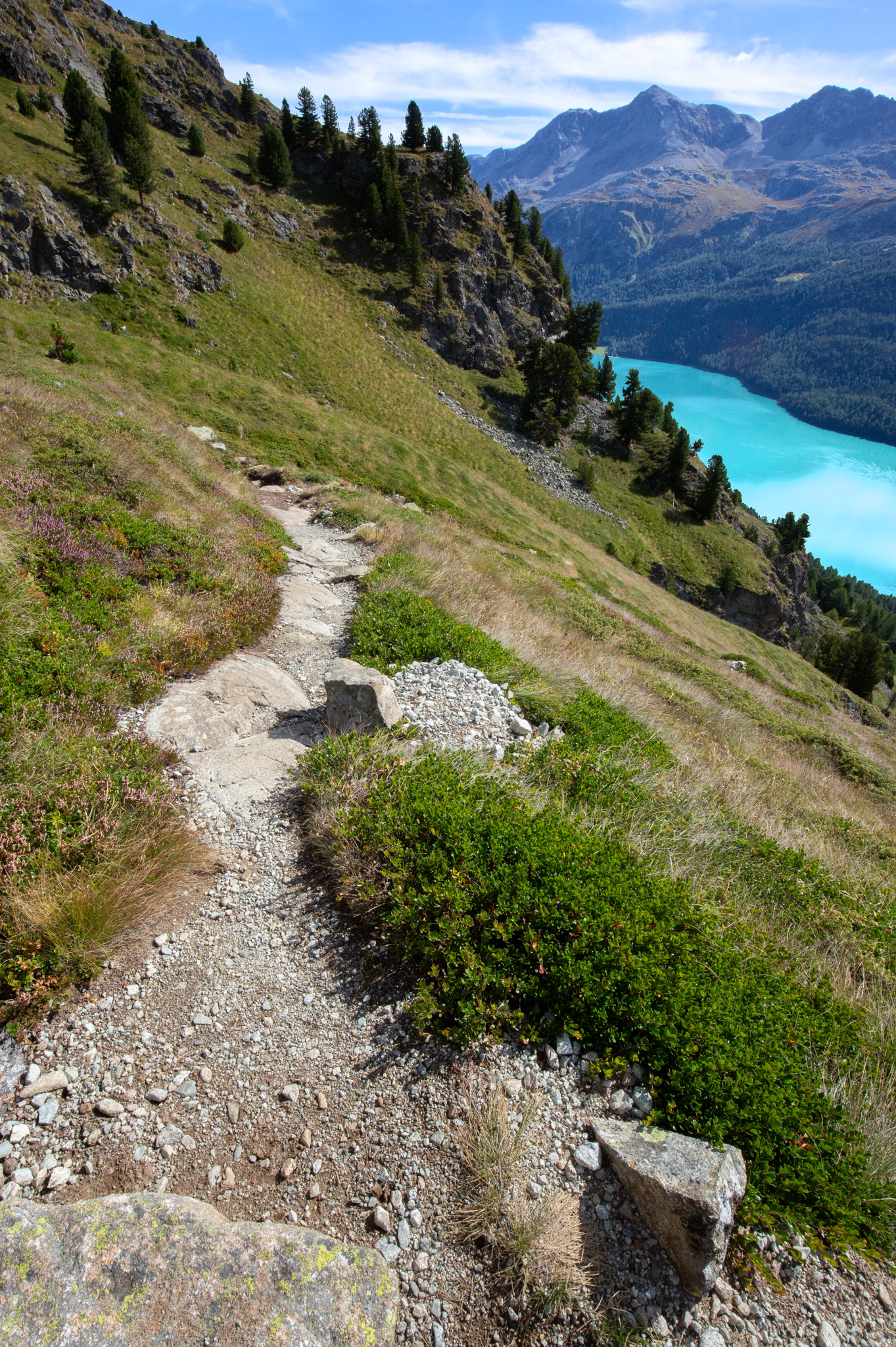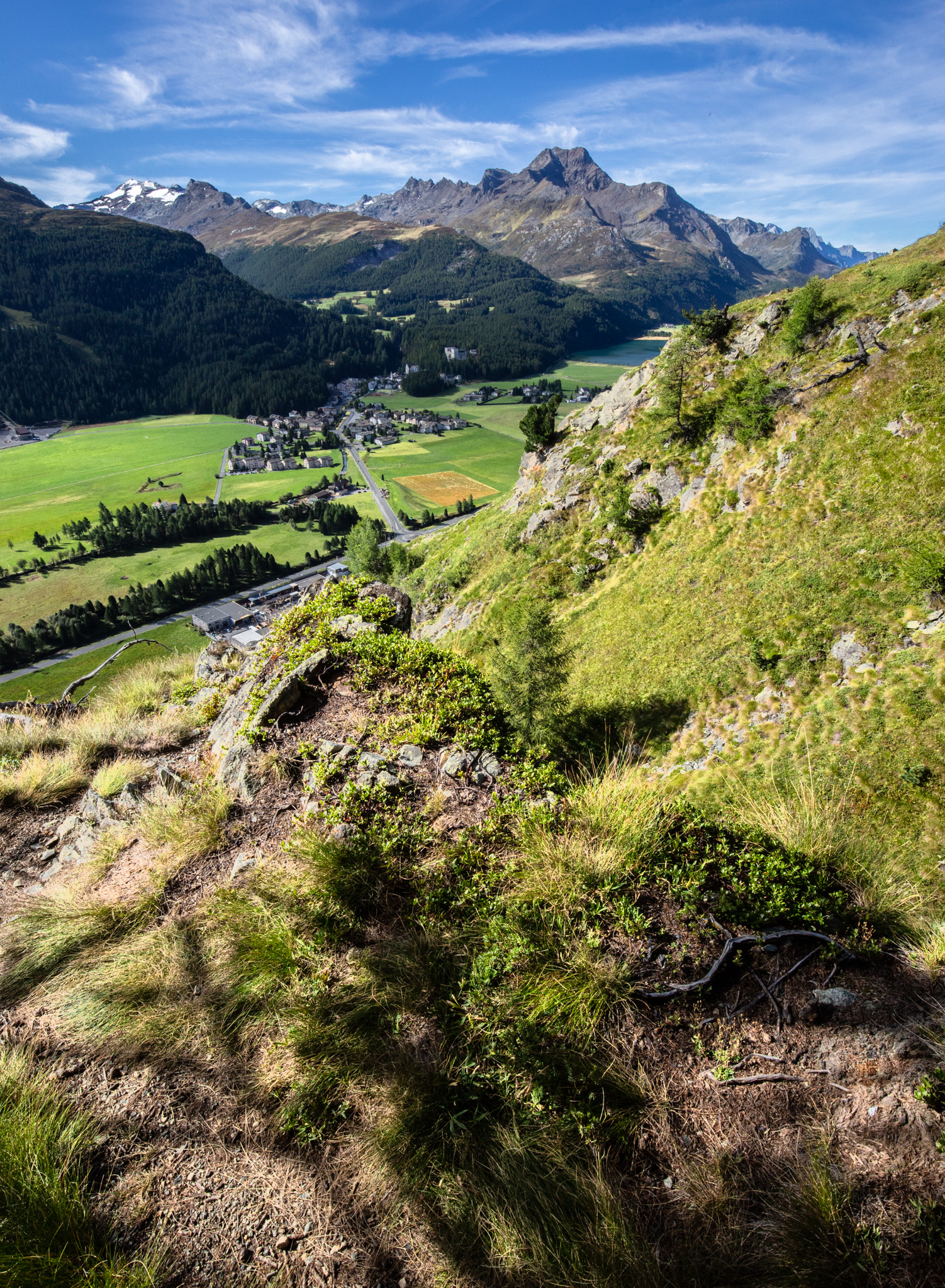 In diesem Spätsommer hatte ich einen Tag zum Wandern, da bin ich zum Linienstudium in die Landschaft oberhalb des Inns zwischen Sils Maria und Silvaplana gelaufen und habe nebenbei Distanzschaffen (Warburg) trainiert. Das sind die Farben und Früchte der Schwelle zwischen Sommer und Herbst. 1000 Jahre sind die Engadiner mit Fleisch ins Veltlin herabgestiegen und mit Getreide wieder hochgestiegen, jetzt befindet sich vor unserem Haus und dem Inn das erste, kleine Getreidefeld. Die Gräser im Tal sind noch grellgrün, aber oben steigt aus ihnen schon das Rot auf und die Lerchen kippen ins Gelb, im Wald rollen die blaue Zapfen der Arven. Aus der Höhe betrachtet strecken sich die Berge südlich des Inns gotisch in die Höhe, Piz Margna wird süchtig mager. Die Verkürzung/ Stauchung durch den Blickwinkel derer, die im Tal stehen, fällt weg. In der Gegend um den Lej da la Tscheppa ist unser Kinderarzt (der von mir und meinen Geschwistern) um 1973 herum auf Nimmerwiedersehen verschwunden. Sein Skelett, Rucksack- und Sohlenreste wurden in der Zeit gefunden, als ich volljährig wurde. Weil Goscha einmal die These aufgestellt hat, ich würde im Alter irgendwann im Urwald, in der Wüste, in der Steppe oder im Sertão hinter dem Horizont verschwinden, statt in Heim oder Haus sitzend oder liegend zu vergehen, auch darum studiere ich solche Gegenden, vorsorglich. Kein Haus zur Sonne (Melle), Landschaft zur Sonne.