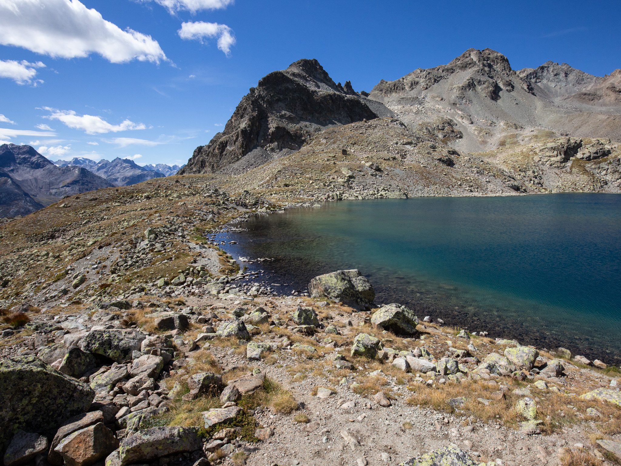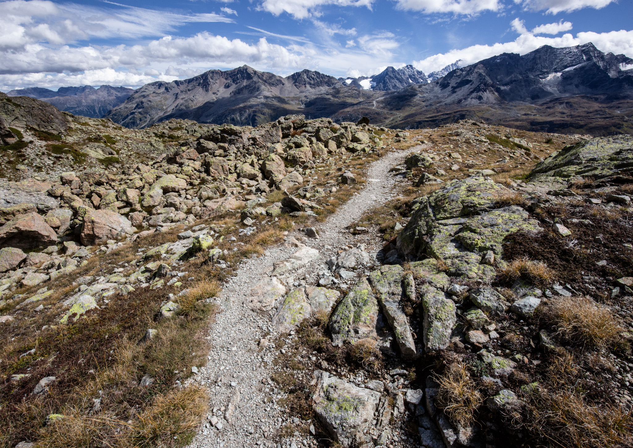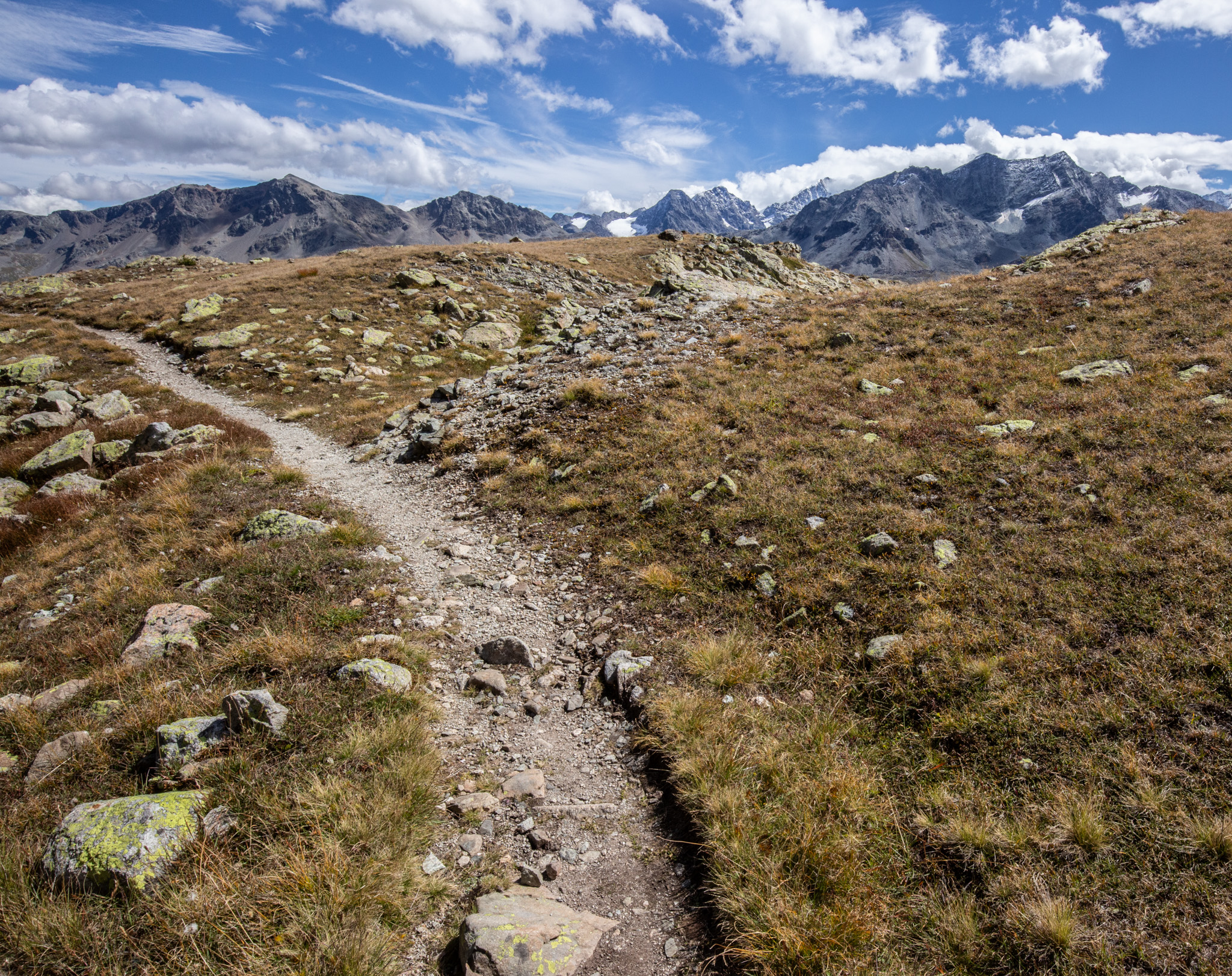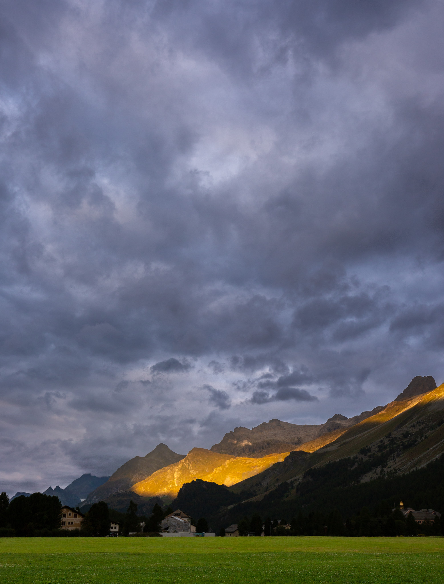 In diesem Spätsommer hatte ich einen Tag zum Wandern, da bin ich zum Linienstudium in die Landschaft oberhalb des Inns zwischen Sils Maria und Silvaplana gelaufen und habe nebenbei Distanzschaffen (Warburg) trainiert. Das sind die Farben und Früchte der Schwelle zwischen Sommer und Herbst. 1000 Jahre sind die Engadiner mit Fleisch ins Veltlin herabgestiegen und mit Getreide wieder hochgestiegen, jetzt befindet sich vor unserem Haus und dem Inn das erste, kleine Getreidefeld. Die Gräser im Tal sind noch grellgrün, aber oben steigt aus ihnen schon das Rot auf und die Lerchen kippen ins Gelb, im Wald rollen die blaue Zapfen der Arven. Aus der Höhe betrachtet strecken sich die Berge südlich des Inns gotisch in die Höhe, Piz Margna wird süchtig mager. Die Verkürzung/ Stauchung durch den Blickwinkel derer, die im Tal stehen, fällt weg. In der Gegend um den Lej da la Tscheppa ist unser Kinderarzt (der von mir und meinen Geschwistern) um 1973 herum auf Nimmerwiedersehen verschwunden. Sein Skelett, Rucksack- und Sohlenreste wurden in der Zeit gefunden, als ich volljährig wurde. Weil Goscha einmal die These aufgestellt hat, ich würde im Alter irgendwann im Urwald, in der Wüste, in der Steppe oder im Sertão hinter dem Horizont verschwinden, statt in Heim oder Haus sitzend oder liegend zu vergehen, auch darum studiere ich solche Gegenden, vorsorglich. Kein Haus zur Sonne (Melle), Landschaft zur Sonne.