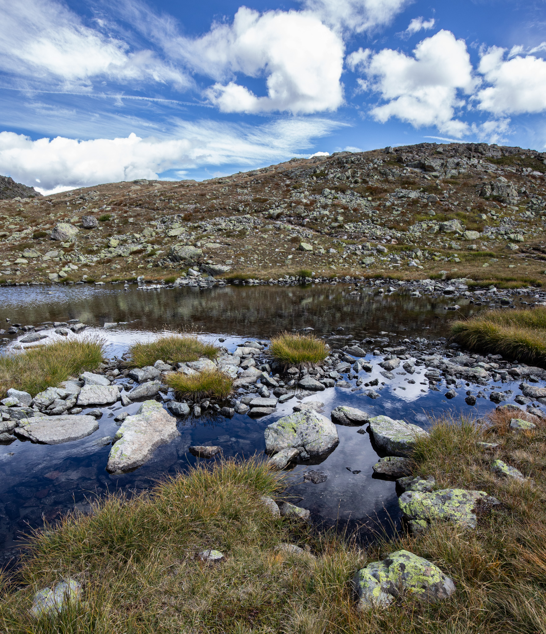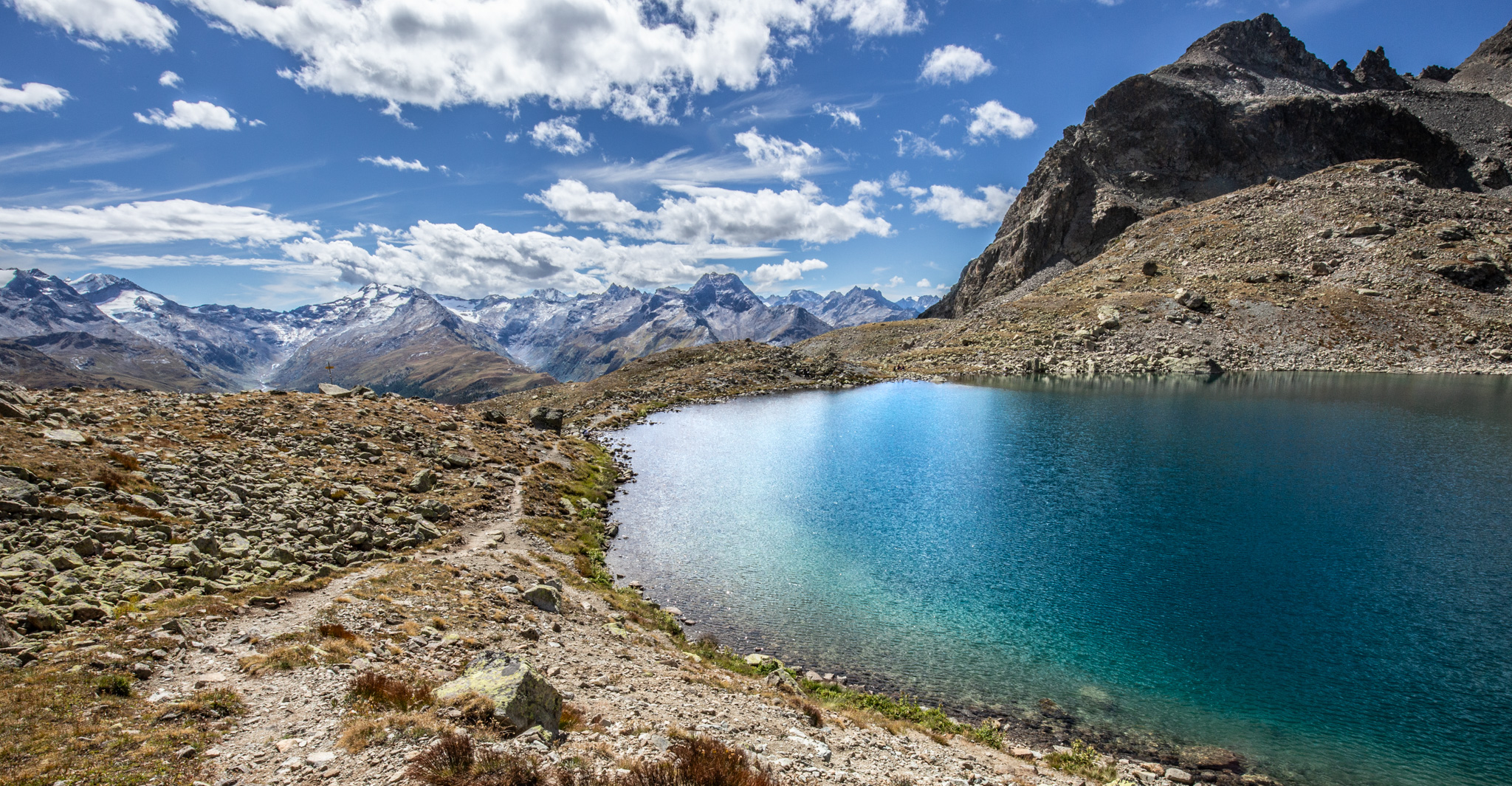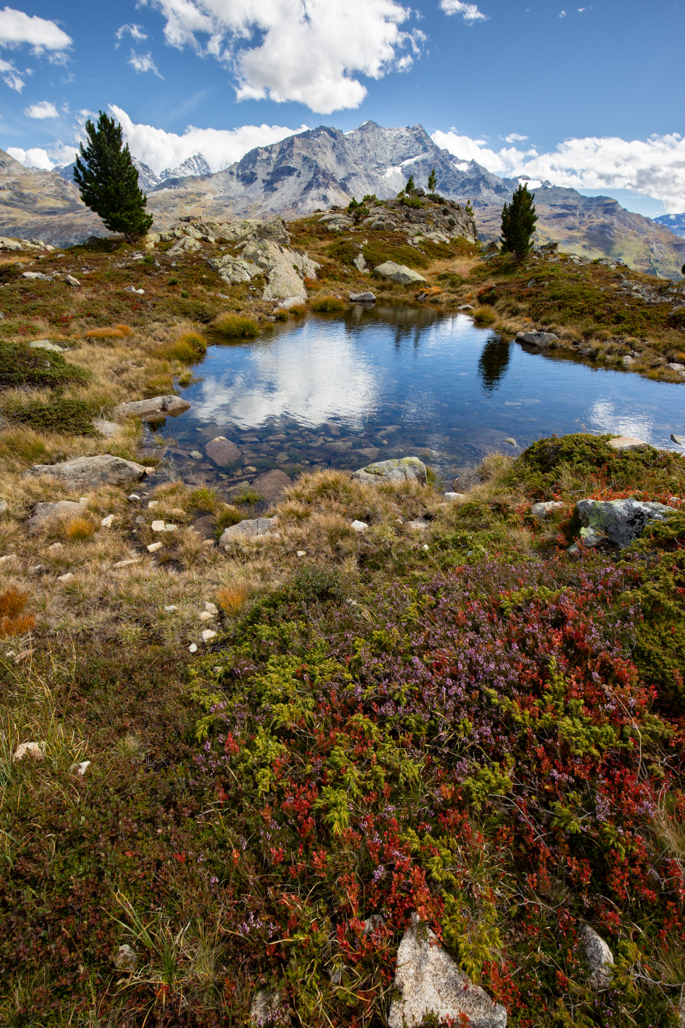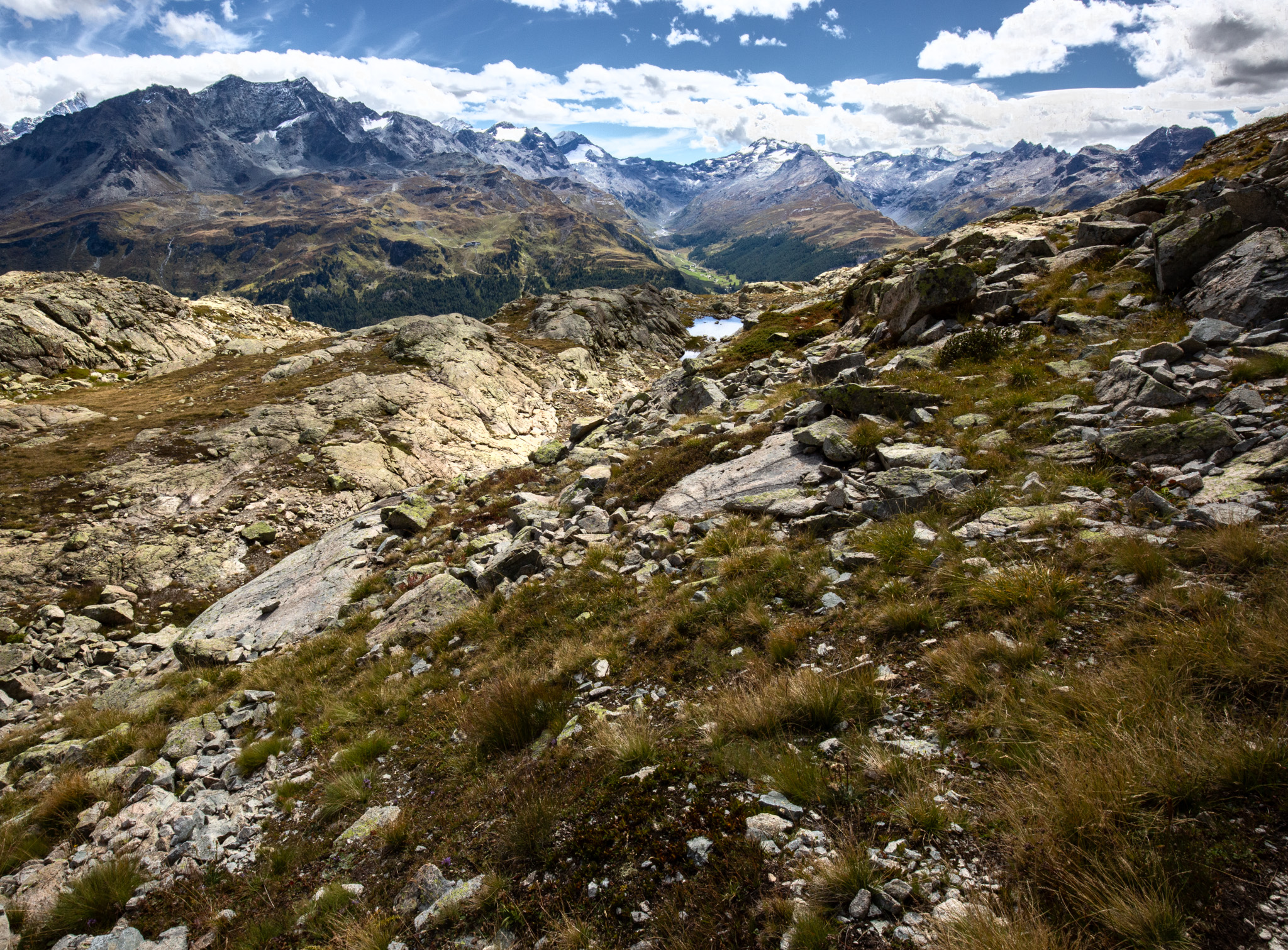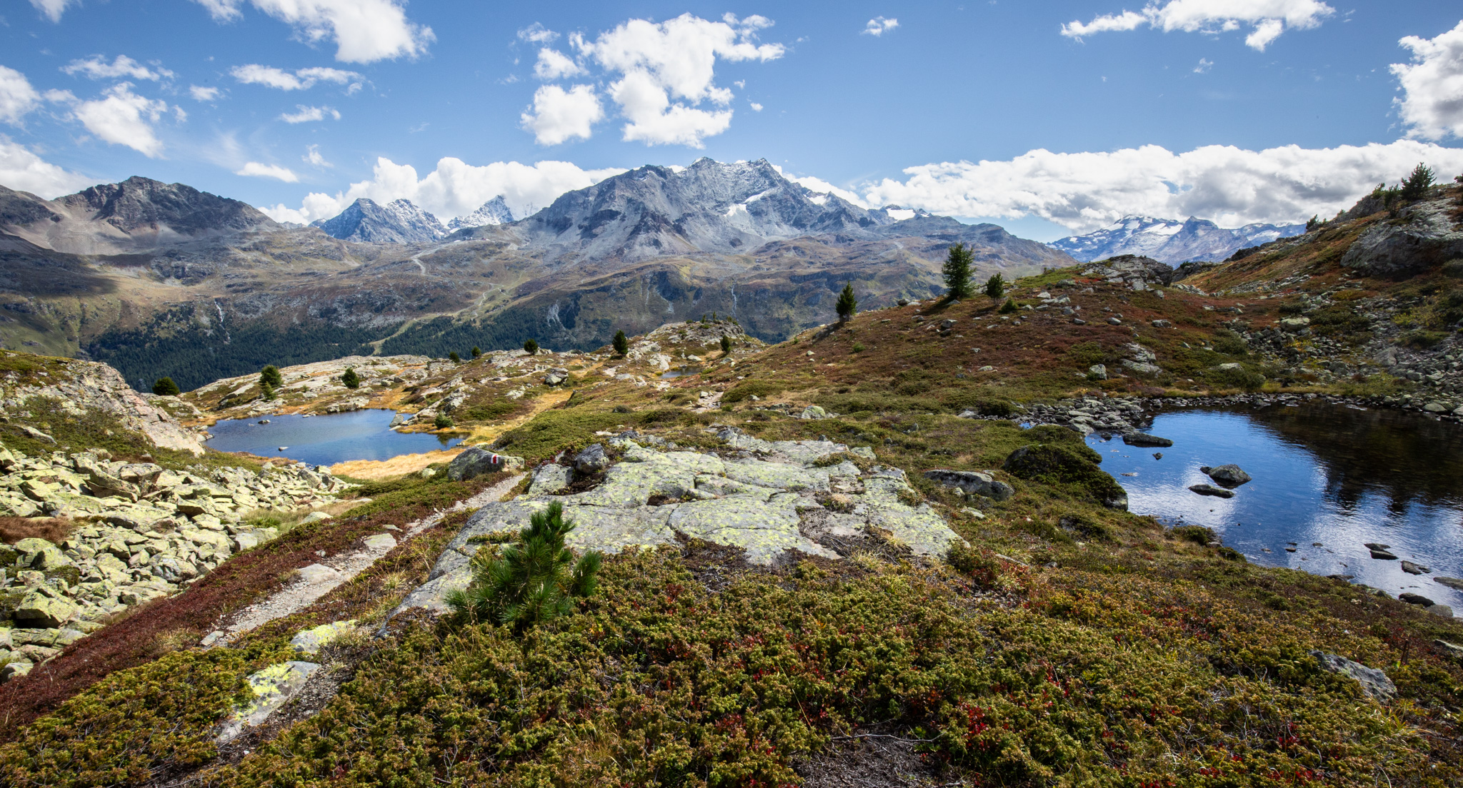 In diesem Spätsommer hatte ich einen Tag zum Wandern, da bin ich zum Linienstudium in die Landschaft oberhalb des Inns zwischen Sils Maria und Silvaplana gelaufen und habe nebenbei Distanzschaffen (Warburg) trainiert. Das sind die Farben und Früchte der Schwelle zwischen Sommer und Herbst. 1000 Jahre sind die Engadiner mit Fleisch ins Veltlin herabgestiegen und mit Getreide wieder hochgestiegen, jetzt befindet sich vor unserem Haus und dem Inn das erste, kleine Getreidefeld. Die Gräser im Tal sind noch grellgrün, aber oben steigt aus ihnen schon das Rot auf und die Lerchen kippen ins Gelb, im Wald rollen die blaue Zapfen der Arven. Aus der Höhe betrachtet strecken sich die Berge südlich des Inns gotisch in die Höhe, Piz Margna wird süchtig mager. Die Verkürzung/ Stauchung durch den Blickwinkel derer, die im Tal stehen, fällt weg. In der Gegend um den Lej da la Tscheppa ist unser Kinderarzt (der von mir und meinen Geschwistern) um 1973 herum auf Nimmerwiedersehen verschwunden. Sein Skelett, Rucksack- und Sohlenreste wurden in der Zeit gefunden, als ich volljährig wurde. Weil Goscha einmal die These aufgestellt hat, ich würde im Alter irgendwann im Urwald, in der Wüste, in der Steppe oder im Sertão hinter dem Horizont verschwinden, statt in Heim oder Haus sitzend oder liegend zu vergehen, auch darum studiere ich solche Gegenden, vorsorglich. Kein Haus zur Sonne (Melle), Landschaft zur Sonne.