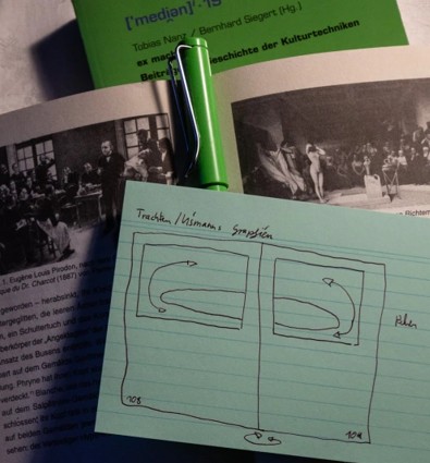 Das heißt, dass ich das Gewand der Phyrne und das Gewand der Blanche (so heißt die Patientin auf dem Gemälde, das den Namen von Dr. Charcot trägt) als Objekt vaguer Linien, als Objekt der Notitia Dignitatum, als kafkaesken Saum/ Schirm und schließlich als Ideogramm der Kanzleien lese. Im Aktenbuch schreibt sie über Graphien/ Linienzüge, deren Tragen ein Trachten ist; im Buch vom Griechenland arbeitet sie noch deutlicher heraus, dass etwas drinsteckt, was Körper, Leib, Person, Subjekt und Mensch ‚haben‘ kann. Ich gehe davon aus, dass die vier Modelle aus dem Aktenbuch und das Modell aus dem Buch vom Griechenland ähnlich sind, verwandt oder affin sein können. Alle Modelle fasse ich im Begriff Vismanns Graphie, alle fasse ich im Begriff Linienzug, alle fasse ich im Begriff Trachten. Dass die Rechtswissenschaft, die mit dem Begriff, dem Bild, der Metapher, dem Medium und dem Text schon monumentale Vorstellungen auffährt, mit denen die exemplarischen Modelle Vismanns und die Konzepte von Graphie, Linienzug und Trachten in gweisser Hinsicht rivalisieren oder konkurrieren, das ist wohl selbstverständlich. Selbstverständlich dürfe auch sein, dass niemand, dem der Begriff und die Metapher des Begriffes, die Metapher oder der Begriff der Metapher und die Texte zu dem, was Texte sedin sollen, genügen, sich mit Graphien, Linienzügen und Trachten befassen muss. Wem Graphien keine Frage stellen, der muss sich nicht damit befassen.
