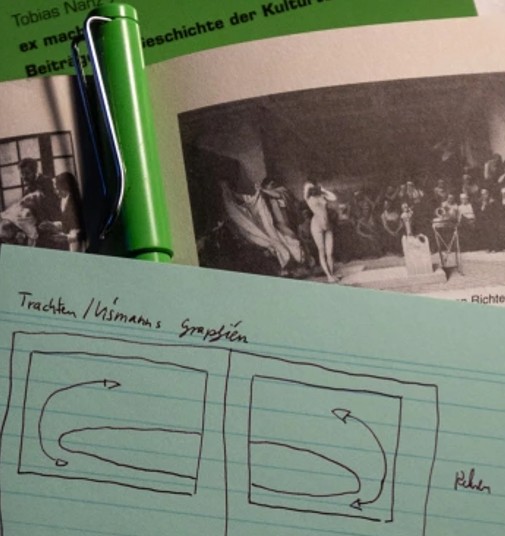 Eine These: Vismanns Graphien tauchen im Kontext ihrer Geschichte und Theorie des Akt und der Akten sowie im Kontext ihrer Überlegungen zu Phryne und den Gewandstudien auf in Form von Trachten und mit der Technik des Trachtens auf. In den Passagen zu Phryne und Blanche und den anderen, beschichteten Wesen (deren Fotos Vismann in der Edition von 2001 nicht zeigt) stecken Elemente einer Geschichte und Theorie der Trachten und des Trachtens. Das ist bei Cornelia Vismann die Geschichte und Theorie eines Begehrens, das durch das Subjekt, durch das Objekt, durch die Handlung, die Aktionen und Passionen geht. Das ist die Geschichte und Theorie eines Strebens, das durch Linienzüge und ‚Beschichtung‘ geht. Wir lesen Cornelia Vismann mit den Augen, mit denen wir auch Aby Warburg lesen. Wir greifen mit den Händen zu ihren Texten, mit denen wir auch zu Aby Warburgs Texten greifen, die selben Händen blättern dort die einen Bilder, da die anderen Bilder auf und zu. Die selben Augen streifen durch Vismanns Schreiben, die durch durch Warburgs Schreiben streifen. Es gibt ein Interesse, das erstens das Interesse an einer Bild- und Rechtswissenschaft ist und zweitens ein Interesse an der Geschichte und Theorie eines Rechts, das nicht ausdifferenziert, nicht stabil oder stabilierend ist, sondern das unbeständig ist. Wir gehen kleinen und unbeständigen Assoziationen nach. Wir schnuppern und fingern an unruhigen Objekten, wir schielen nach beunruhigenden Objekten.