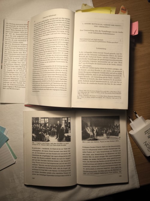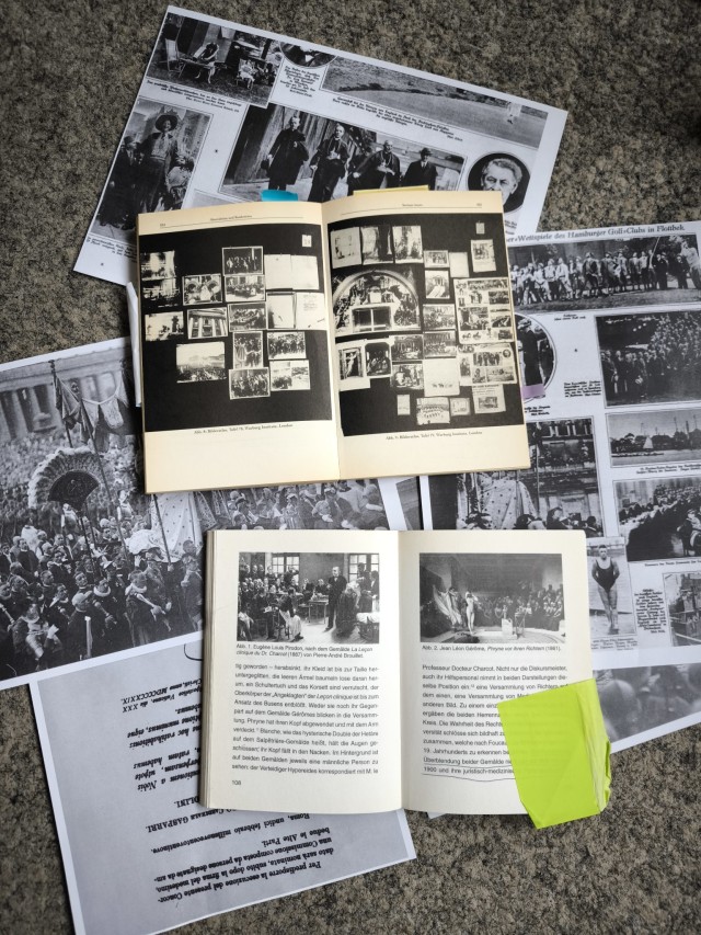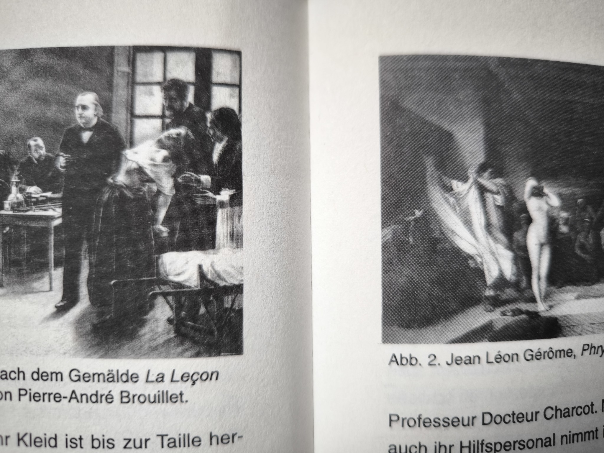 Das Wesen, das den Platz des Dogmas der Ebenbildlichkeit einnimmt, organisiert seine Ähnlichkeit auch darin, bekleidet und darin betrachtet, dazu auch tragend und trachtend zu sein. Vismanns Bild- und Rechtswissenschaft zielt auch auf das Menschenbild und seine Assoziationen. Sie nimmt mit den beiden Gemälden, die sich zur Illustrierung der Texte ausgewählt hat, Formen des Subjekts, der Person oder des Menschen in Blick, die im Zug sein sollen. In dem Buch hat sie dabei eine Doppelseite gestaltet, zwei Gemälde aus dem systematischsten aller Jahrhunderte zu einem Kreis, genauer gesagt zu einer Ellipse angeordnet. Man kann sich gut Vorstellung, dass die Zuschauer im Bild Theoretiker sind, Beobachter wohl auch. Charcot (mit Assistent und Schwester) und Hypereides, Blanche und Phryne sind diejenigen, die das Trachten/ die Trachten/ die Betrachtung aufbringen. Charcot lässt Blache aufstellen, wie ein slide, wieso wie? An Blanche gleitet das Gewand tatsächlich ab; sie folgt dem Schlitterprotokoll, die Form ist im Zug passioniert dargestellt. Hypereides in der Version, die Gerome aufgreift, macht die Form im Zug zum aktiven Motiv des Bildes. Vismann fokussiert das Menschenbild über ein Denken des Außen, dessen Form im Zug ist.
