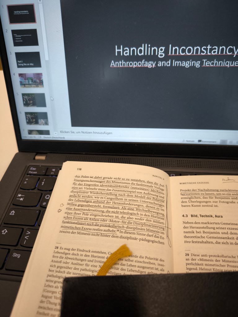Die Vorstellung des Gemäldes wird heute ein Beispiel für Seing like an Aby, d.h. seing like the Aby; die Methode also: Einfühlen in das, was Aby Warburg an dem Gemälde erfahren und wahrnehmen könnte. Ihn gefressen haben, so beschreibt das Melanie Merlin de Andrade. Ich stütze mich nicht auf Notizen von Warburg zu Holbein, sondern auf die Aufmerksamkeit für alles das, was mit dem Verschlingen, Verzehren, Verkehren und Begehren zu tun hat. Denn das, so würde ich unterstellen, wäre das, worauf Warburg achten würde. Ich spreche von dem Aby Warburg, dessen visio/ phantasia vor allem in den Jahren 1921-1923 zu hohem Pathos ausschlägt, hochgetriebener Passion und Pathologie Form gibt (für die Jahre 1921-1923 gut dokumentiert und publiziert) und ihn in wiederkehrenden Episoden dazu bringt, kannibalisch zu sprechen, also nicht nur als oder wie ein Kannibale zu sprechen sondern im Sprechen durchbrechen zu lassen, dass er einer der Kannibalen und unter Kannibalen sein soll. Sein Sprechen wird teils ein Verschlucken, teils wird es zum Bericht über das Kannibalische in Kreuzlingen.