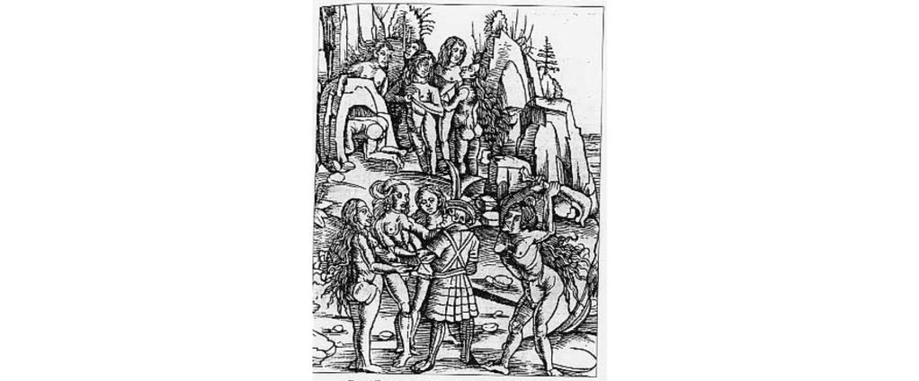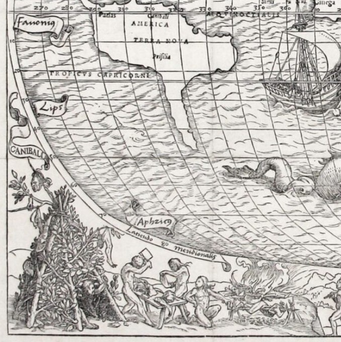 Bevor Hans Holbein 1533 auf ein Gemälde in hohem Stil das Land der Tupinamba (Tupi) zur Referenz und zum Orientierungspunkt gemacht hat, kooperiert er als Graphiker mit Sebastian Münster und ist so an der Zeichnung und dem Druck der Weltkarte von 1532 beteiligt, in deren Rahmenwerk sich Darstellungen finden, die später zum Vorbild von Thevet und Staden geworden sein könnten (Arbeitsthese). Münster liefert die Karte und sammelt dazu auch ‚Tales‘ aus der Literatur (von Johann Huttich and Simon Grynaeus). Holbein erstellt die Vignetten, also den Rahmen mit den Figuren, in denen sich die Darstellung der Kannibalen finden. Zu sagen, dass Holbein auf dem gemälde mit dem großen und dem kleinen Stil das Land der Kannibalen und der Anthropofagen zur Referenz und zur Orientierungspunkt anthropovaguer und anthropolarer Wesen macht, bevor sich der Mythos und der Logos über die Gegend gelegt haben, meint insofern, dass Holbein noch mit dem normativen Material arbeitet, das man rumour /Rumoren) oder Gerücht nennt, denn weder Huttich noch Grynaeus waren, anders als den Staden und Thevet, Brasilienreisende. Ist man geographisch nachlässig oder großzügig (die Tupinamba wären es wohl auch), kann man freilich sagen, dass Holbein sich auf Berichte der Reisenden stützt, die von Kannibalismus in der Karibik erzählen. Dazu gehören Columbus Tagebücher, die ab 1511 publiziert werden und in Europa zirkulieren. Und schon ab 1503 zirkuliert, dazu noch populär, Vespuccis Mundus Novus, von dem man sagt, dass dieser Text zuerst den Kannibalismus mit Brasilien assoziiert hätte. Die Geschichte ist und wird erforscht.