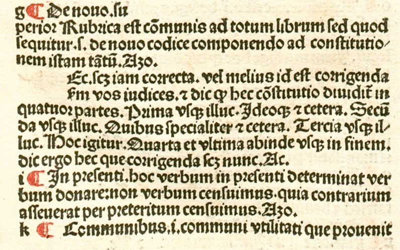 Die Abbildung zeigt Folio 1r aus einem Corpus Iuris Civilis, der 1488 gedruckt wurde und heute in der Münchner Staatsbilbliothek liegt. Bevor ich auf die Ziele des Projektes im einzelnen eingehe, will ich aufspüren, welche Letter das Beispiel zu sehen gibt.